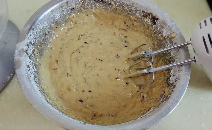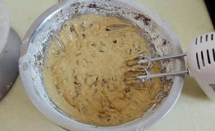 筛入180克低粉、泡打粉、小苏打,快速搅拌均匀,尽量不要让面糊起筋。