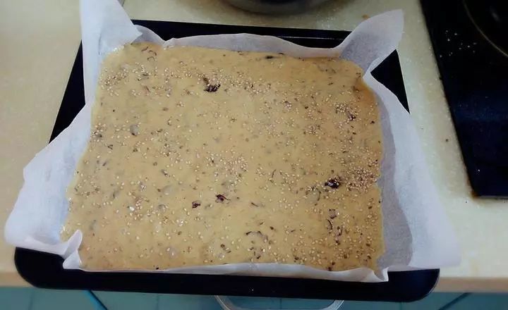烤盘铺好硅油纸,面糊倒入烤盘撒上白芝麻。160℃40分钟左右。烤至 30分钟左右时蛋糕上面可以用硅油纸盖住,防止颜色太重。烤好的蛋糕用手一拍很有弹性的!